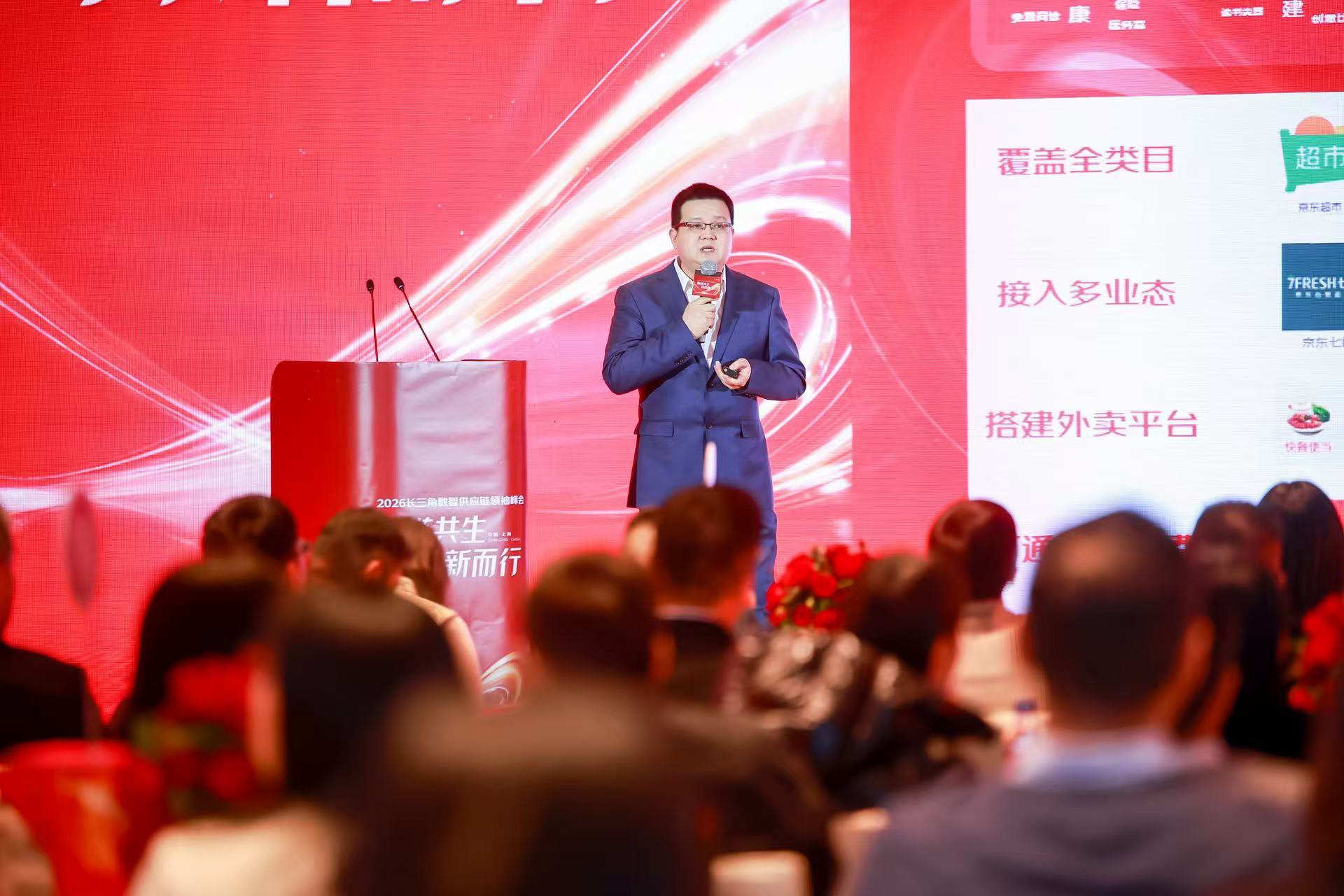 京东政企业务相关负责人致欢迎辞,京东定位于以供应链为基础的技术和服务企业,二十余年来始终深耕供应链领域,希望以本次峰会为契机,与各位同仁一道,共同书写长三角数字化供应链高质量发展新篇章。
